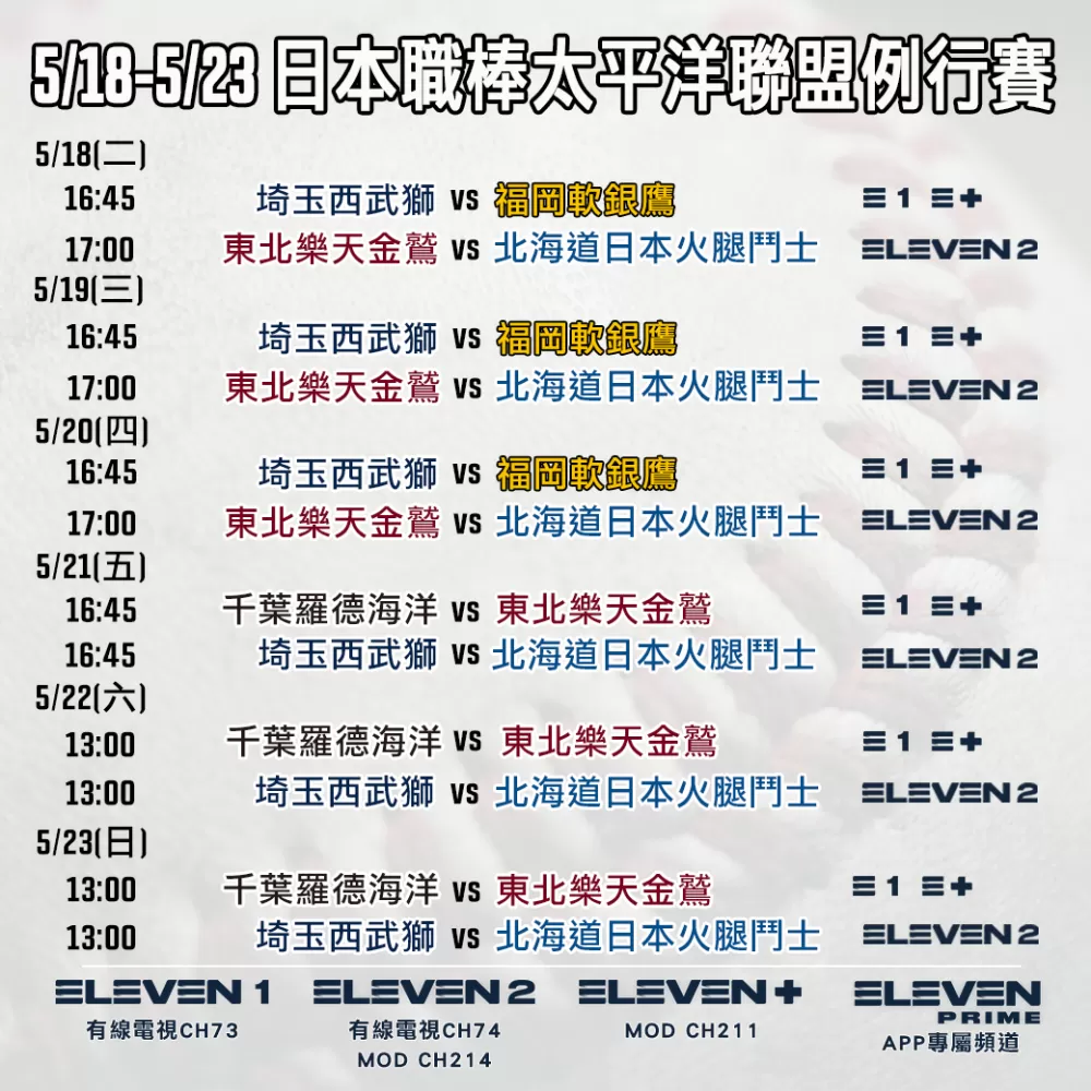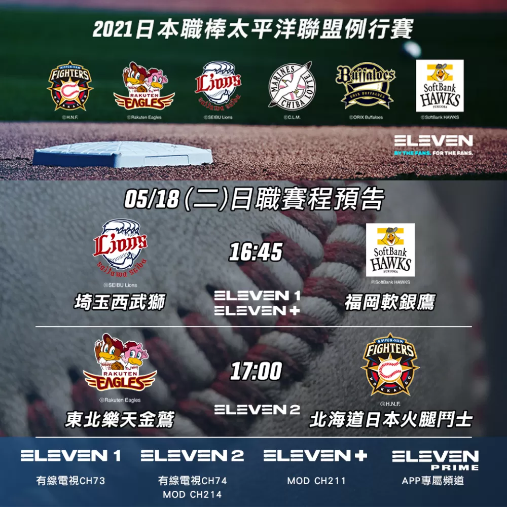 有興趣的觀眾可以鎖定ELEVEN體育家族,火腿的五戰客場賽事在ELEVEN體育二台、有線電視74台和中華電信MOD214台,或下載ELEVEN體育家族官方APP完整收看。