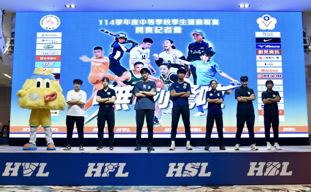 114學年度中等學校學生運動聯賽2日在格萊天漾大飯店舉行開賽記者會,高中體壇包括籃球(HBL)、排球(HVL)、足球(HFL)、壘球(HSL)代表球隊齊聚一堂,宣告新賽季正式開始,以及青春無悔的口號「嘸咧驚啦」!